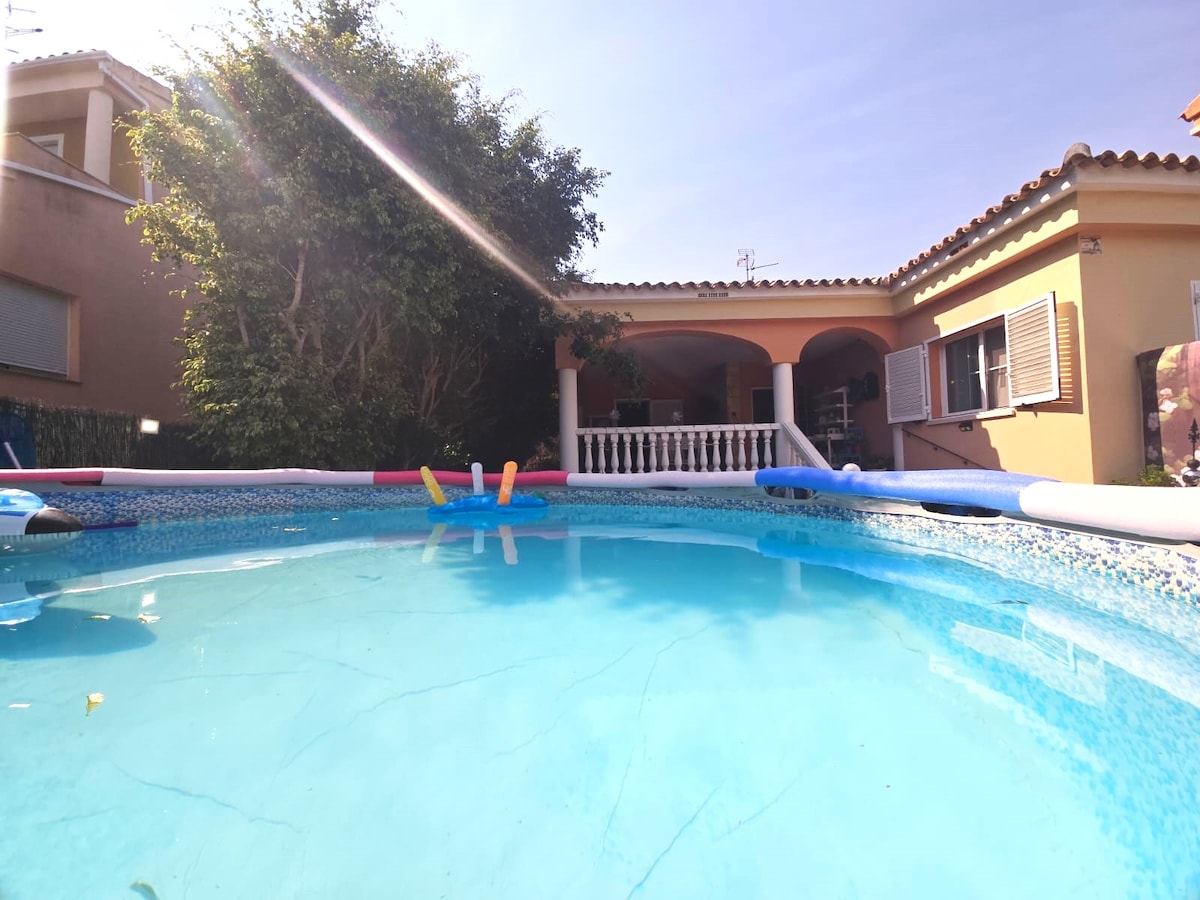 Os presento mi magnífico chalet, donde pasar unos fantásticos días en familia ya que tiene un montón de espacios creados para la diversión Gran jardín con piscina, que hará las delicias de grandes y pequeños, con ducha solar y juegos de piscina Al mediodía que mejor que disfrutar de una buena barbacoa en el jardín Y ya por la noche podéis pasar una bonita velada, en el porche, ya sea viendo la televisión, juzgando a la diana, tomando una copa de vino