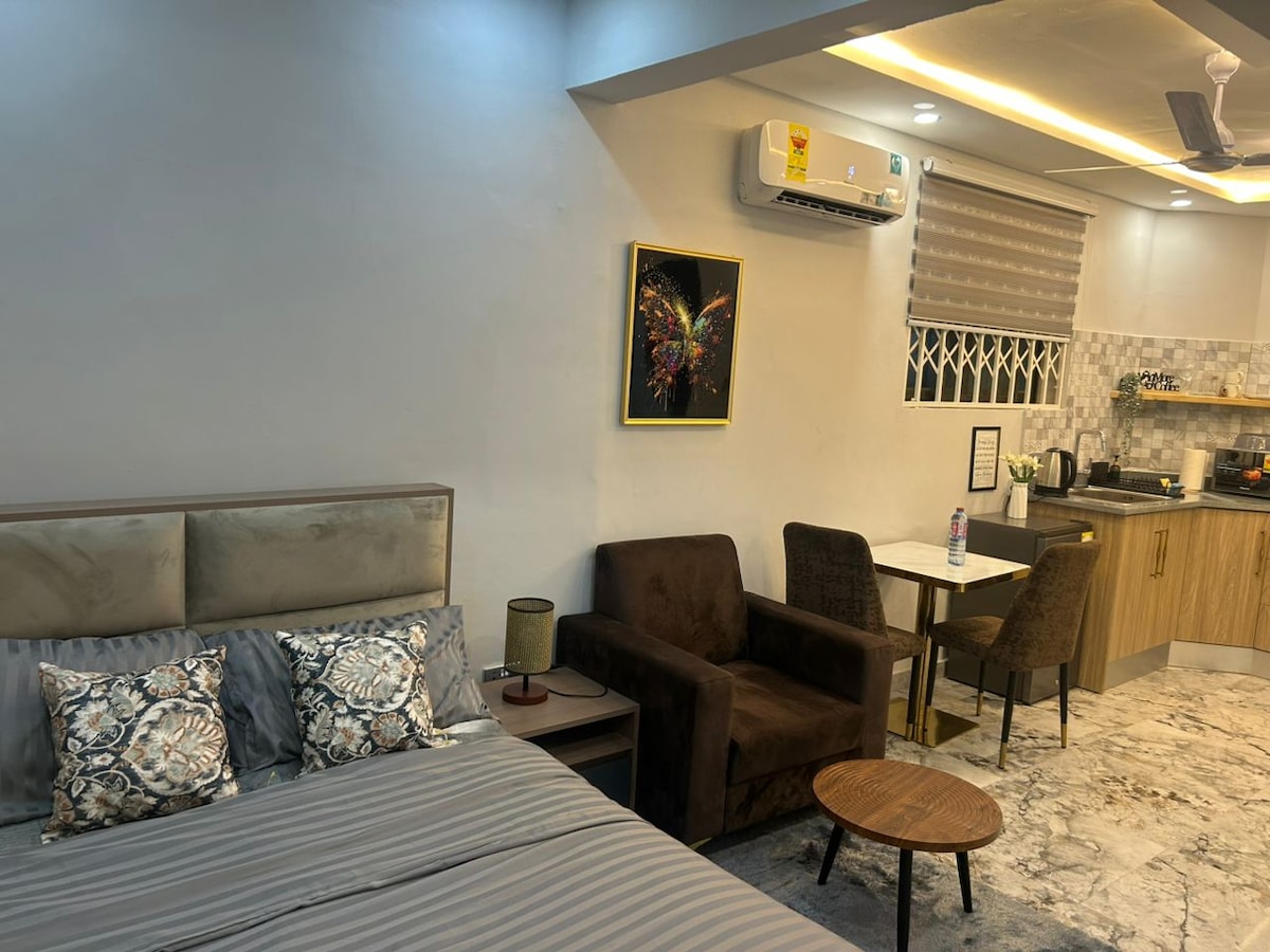 This elegant luxury studio blends comfort and style, featuring rich wood ceilings and a stunning crystal chandelier. Enjoy free unlimited high-speed Wi-Fi, a plush bed, modern ensuite bathroom with hot water, and a kitchenette with fridge, microwave, and kettle. Step out to your private front porch seating area. Ideally located in Greda estates just minutes from Osu, Cantonments, East Legon, and a short drive to the airport — perfect for business or leisure stays. Private safe also available