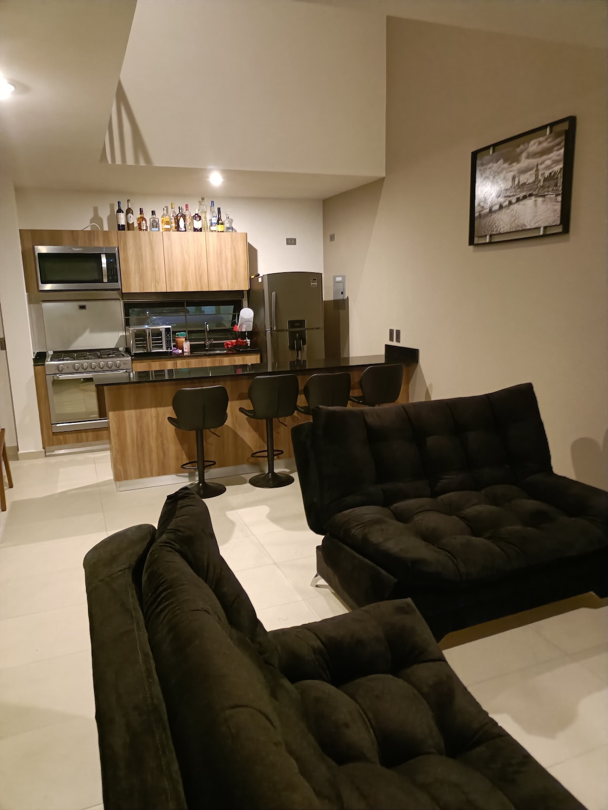 Fully equipped luxury apartment, located in Residencial Almaterra. Feel at home in a cozy, modern and functional apartment in a residencial with 7-a-side soccer field, chess tables, barbecue area, rest areas, outdoor gym, playground, jogging track, green areas, mobility and transportation. Just 1min from Fabrica de Cloe, 5min from Capithal Park Colotlan, less than 15min from Hacienda Sta Lucia, La Magdalena and Benazuza and only 18min from Tec de Monterrey.