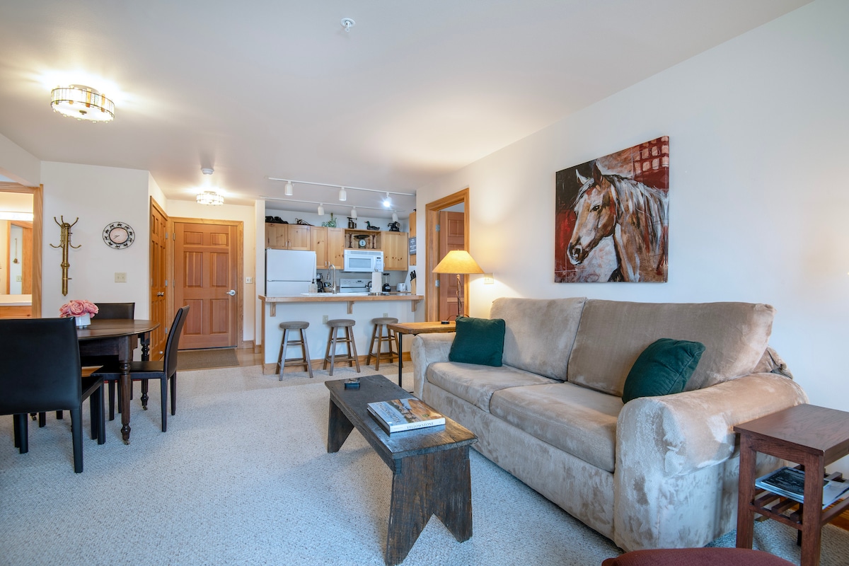 Located just 8 miles from Grand Targhee Resort on Ski Hill Road, Teton Creek Resort offers proximity to Grand Targhee Winter and Summer Activities, Teton Canyon, and multiple restaurants, shopping and outdoor activities. This one-bedroom condominium is on the second floor and has an open-concept living room/dining room/kitchen. The bedroom sleeps four guests comfortably with two comfy queen beds with West Elm bedding, a large closet, and adjacent to the hall bathroom.
