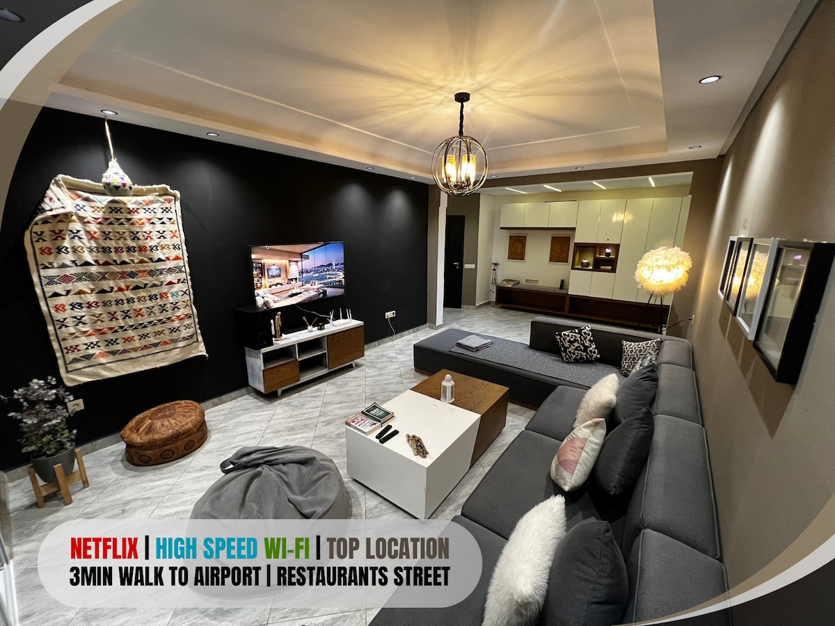 ✨L'appartement Panoramique à les jardins bleus se caractérise par son design à la fois moderne et élégant, chaque élément étant soigneusement conçu pour vous garantir une expérience sans pareille ✨Son emplacement central ✅ Appartement avec vue panoramique sur la mer et à proximité de : ✅ 1 min de la plage de Martil 🏖 et sa fameuses corniche ✅ 5 min de la Plage de Cabo Negro 🏝 ✅ 4 min de Ikea et KFC 🍗 ✅ 6 min de Marjane et McDonald's 🍟 ✅ 1 min restaurants cafés, commerces