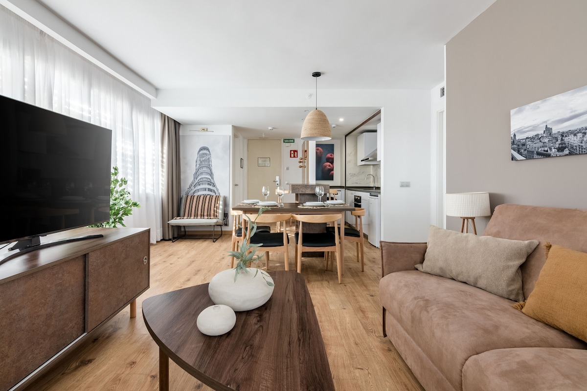 This beautifully designed apartment combines comfort and style, making it ideal for up to 4 guests. The apartment features bedroom, bathroom, a cozy living room with a sofa bed and TV, as well as a fully equipped kitchen and dining table - perfect for a relaxing and comfortable stay. Conveniently located just a short drive from Madrid Airport and only a 5-minute walk from the Planilonio Shopping Mall. It also offers excellent proximity to IFEMA Convention Center and the Metropolitano Stadium.