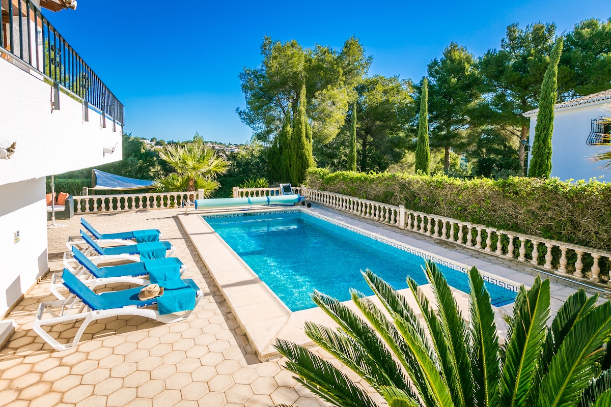 Casa Nido, modern and comfortable villa with private pool in Moraira, Costa Blanca, Spain. The villa is located in a coastal, residential and mountainous area, close to restaurants and bars, shops and supermarkets. Three bedrooms, two bathrooms, both with shower, one en-suite. Fully equipped kitchen with fridge, oven, induction hub, microwave, Nespresso, wine cooler and coctail bar. El fresco dining and barbecue. Kidney shaped pool with outside shower. A large garden completes the villa.
