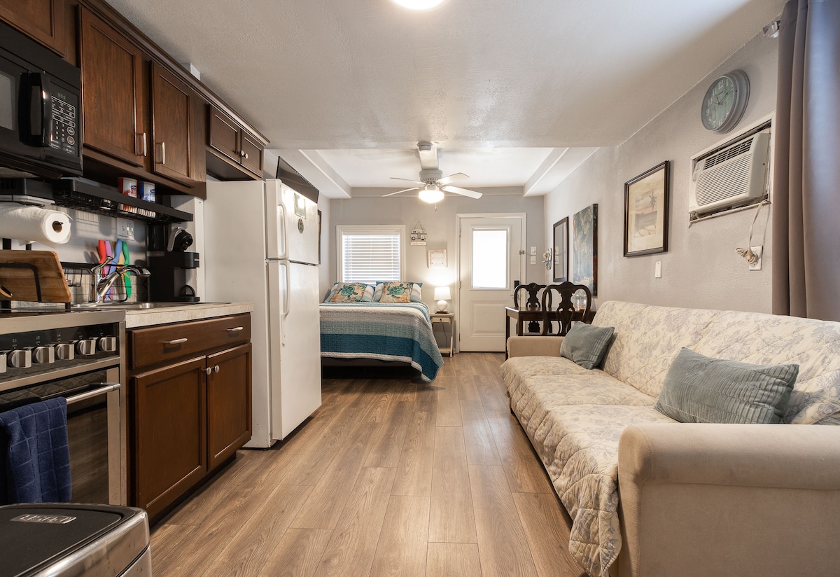 This centrally located studio apartment is just a few minutes drive to all of Galveston's major attractions. The apartment has been updated with new flooring, paint, furnishings, cold AC, etc. It is located behind the main house in a separate building with a private entrance and a parking area for use by guests. Guests have access to the backyard of the main home. No loud behavior out of consideration for neighbors. Several convenience stores within walking distance. 0.6 miles to beach.