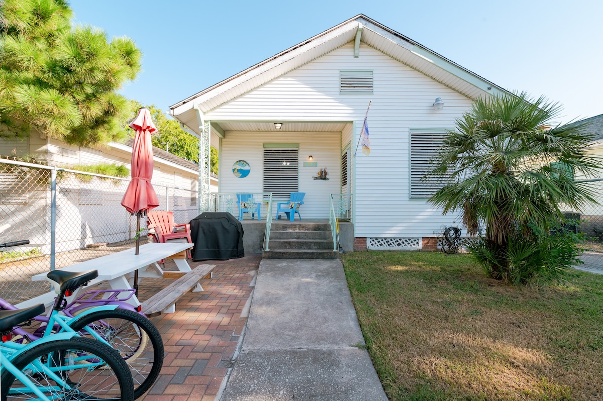 -Casita De Palmera- Relax on the lighted, palapa-covered deck with your coffee or cocktail! Family + pet friendly! Less than a half mile to Galveston's Historic Downtown area and a short 4 minute drive to the beach! Close to all of the fun, shopping, live music and restaurants on The Strand! -Fenced backyard -800+ MBPS Wifi -4 Smart TVs w/ Roku capability to stream with your accounts -Arcade & board games -Wood Grill -Beach towels & toys Close to cruise terminals & ONE block to cruise parking!