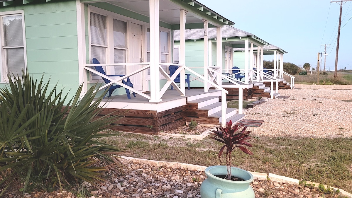 Plenty of natural light in this one bedroom studio well appointed with two queen-sized memory foam mattresses and hotel quality bedding. The closest Airbnb to the Rockport beach (Rated best beach in Texas!) with a peek of the bay from the balcony. Relaxing and quiet inside and around the corner from historic downtown Rockport, with boutiques, museums, shell shops and bars. Beach chairs, awnings, cornhole, beach toys, bocce and ladder golf available to borrow.