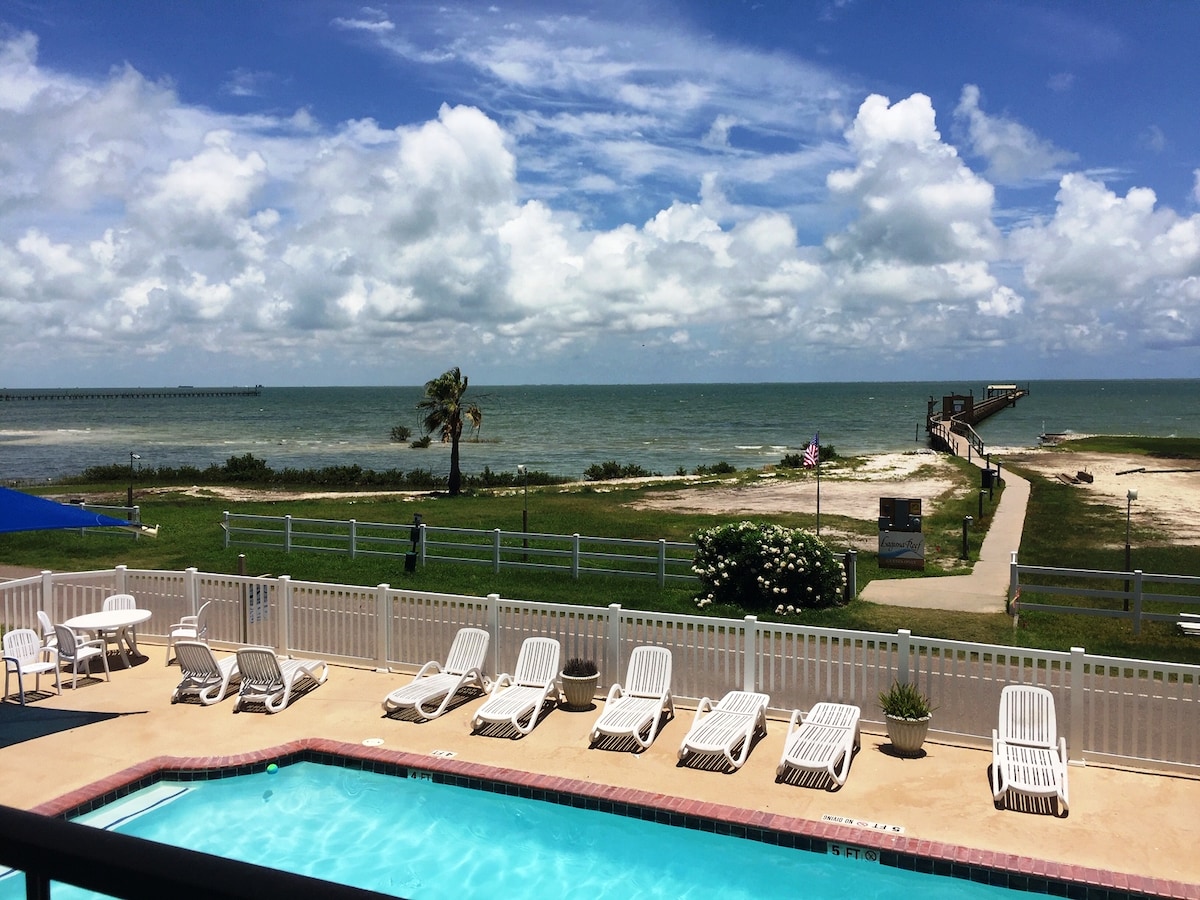 Looking for a peaceful getaway? Our relaxing 2nd floor studio condo in Fulton, TX. is the perfect place to unwind! Just steps from the Gulf, you can enjoy the pool, shuffleboard, or have a cookout while enjoying the breathtaking views! Room has two comfortable Queen size beds and a sleeper sofa. Kitchen comes equipped with everything you need to cook a quick meal. Other amenities include a refrigerator, desk, games for the kids, a Keurig, towels, shampoo. Short drive to Port Aransas and Corpus!