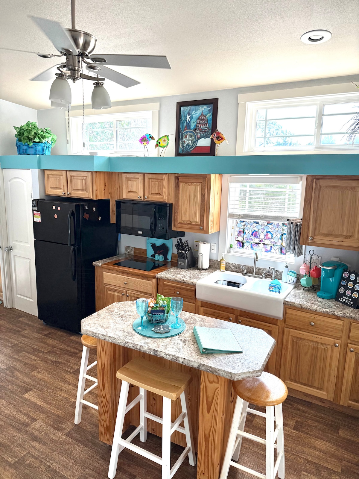 This tiny house has all the amenities of an upscale hotel room yet with unique and exquisite design and decor. A queen size bed with a super-comfy Tuft & Needle mattress will help you fall asleep fast. A full size shower and bathroom is snuggled into the back of the unit and has endless hot water! For your morning coffee a Keurig and K-cups are provided along with a microwave for heating up your popcorn in the evening. Climb up to the rooftop deck for stargazing or your morning coffee.
