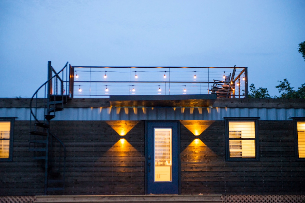 The Mainsail is a tiny container home handcrafted by CargoHome™ right here in Waco. With 1 bedroom and an inflatable floor mattress, it sleeps uptimes to 4 people. Features a super comfy Tuft and Needle queen mattress. The rooftop deck lights up beautifully at night and is a great place to stargaze or enjoy a morning coffee. Full size, custom-tiled shower and spacious bathroom completes this beautiful home. Just a short 12 minutes to Magnolia and Baylor.
