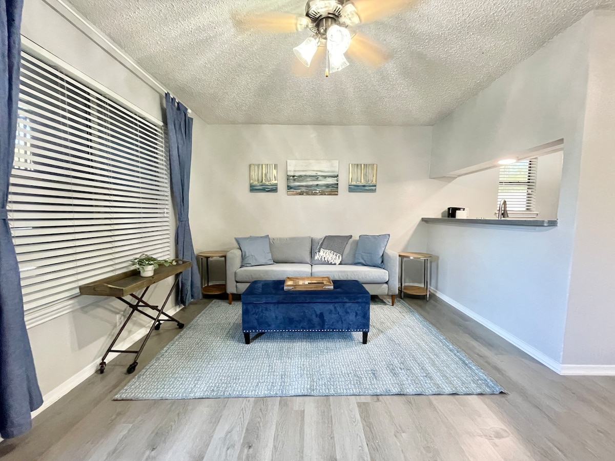 This open concept 1200+ sq foot studio suite encompasses the entire 2nd floor of the Roomers House, with amazing views of the gulf, pleasure pier and seawall blvd. This suite features a full kitchen, amazing bath (with large walk in shower), washer/dryer, 65” TV with Hulu Live TV, adjustable Mini Split HVAC, high speed Wi-Fi, two private decks, assigned private parking & sleeps up to 4 with two pillow top king sized beds.