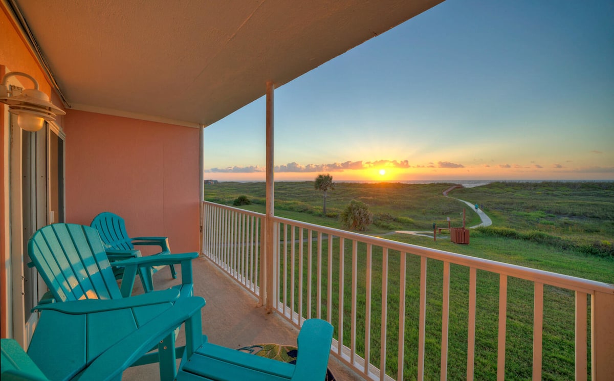 This beloved beachfront corner studio condo between Stewart Beach and East Beach has a large balcony and expansive gulf views. It is well-appointed for two or for a solo retreat. Resort offers pool and pickleball! No street to cross to get to the beach, yet the condo is close to downtown Galveston and the Seawall. Enjoy the gorgeous sunrises and moon gazing, track cruise ship comings-and-goings, check out the activity on the beach, float in the heated pool, or relax and watch the waves!