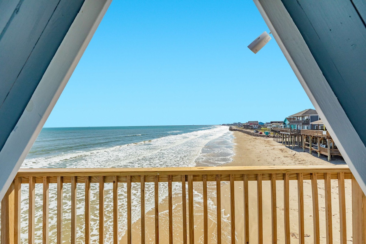 Unobstructed ocean views! See all the way down the beach to Galveston. Four bedrooms and 3 1/2 baths. Plenty of space and several decks for enjoying the sun. You have space to entertain, inside the beach home , but also underneath where you will find a large built in bar, propane/charcoal bar b q , swings, hammock loft and outdoor shower. Fenced in yard. Private walkover to the beach. Gourmet kitchen with butlers pantry. Tv's in every room. Master has soaking tub with beach view! Sleeps 14