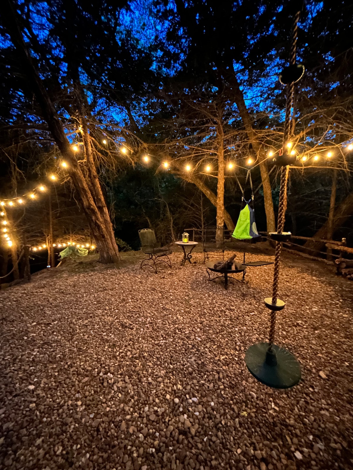 Chill on your deck at night soaking in the beauty of the sun setting over the lake, & marvel at the "firefly" solar lights in the tree illuminating your private nature sanctuary. Relax in your private hanging tree hammocks, or have some fun on the water and rent ON-SITE kayaks, paddle boards, or canoe. Rejuvenate with a private yoga, personal training, or massage session? We are a 4 minute walk to Stonehouse Vineyard winery, and just up the road from Krause Springs spring-fed swimming hole!
