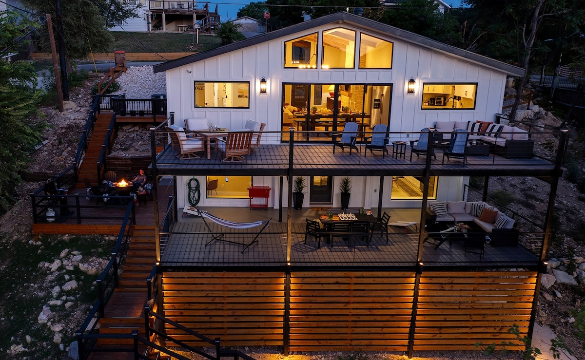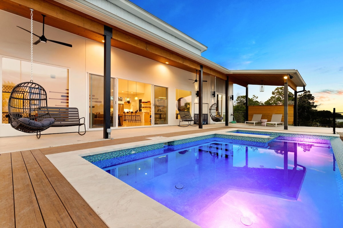 "My family had a truly great time here! Amenities A++. Beautiful and fun!" --Matan. Welcome to Lago Vista Vibe, a serene Texas Hill country getaway. Enjoy the elegant backyard and free heated pool with waterfall, cabana, and swim up bar. Perfect for families with kids, small groups and/or couples looking for a retreat. Adventurous? Enjoy scenic hiking, local craft beer, lakeside parks with boat ramps, fishing, picnic areas, wine tasting, golfing, views, and zipline adventures nearby.