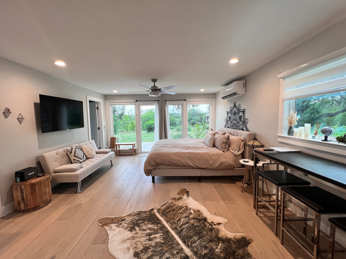Like a high-end hotel room, this well-appointed suite with small kitchen & spacious bathroom on unique 10-acre urban ranch is situated in the middle of bustling South Austin. Enjoy stunning sunsets over the hills through a wall of windows or from your private patio. Fantastic birdwatching, wildflowers, & deer sightings on the land. Ideal for those seeking natural beauty within the city. You won't believe you're only 15 minutes from downtown Austin! Age 25+ Please clear pets with owner!