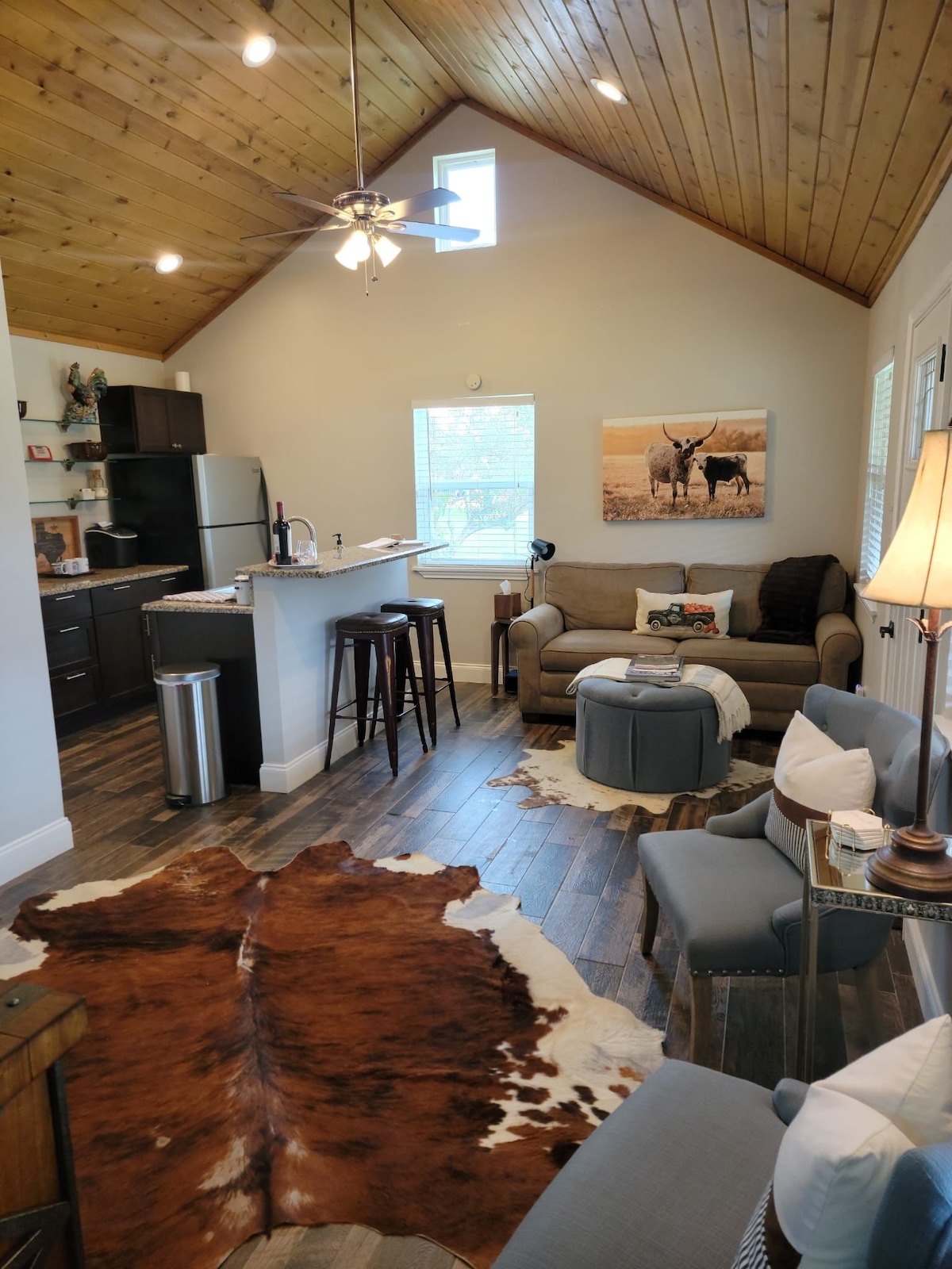 Experience country elegance and tranquility while being tucked away and within minutes from Dripping Springs and Austin. Grab a book and laze on a lounger on the large shaded porch, or take a relaxing stroll around the ranch and admire the longhorns. This guest house is located on a 13 acre hobby ranch in Austin on the boarder of Dripping Springs. Walk down to Barton Creek. The water is cool and clean. Private and Gated. Gate access code and private keyless entry code to your home will be provided at time of reservation. 512 909 4515 The manicured property is located on a private, 13-acre hobby ranch in Austin on the border of Dripping Springs. Walk down to Barton Creek or visit the longhorns in the pastures. Evenings are magical on the expansive porch; very romantic. We are 15 minutes from almost everything and in the heart of the wedding and winery venues. Uber and Lyft are available.The Hill Country Galleria is an incredible shopping and dining destination. Tex Mex, Italian, Mexican Parrila, Fine Dining, casual Dining, all within 15 minutes. Of course you are welcome to prepare your own food in the fully equipped full kitchen. A side note: we have a family of wild turkeys that visit the property, as well as abundant wildlife. We also free range our 3 chickens and 3 dusks named Larry, Curley and Mo. We also have 3 female Longhorn, Toodles, Daisy and Clarabell. The manicured property is located on a private, 13-acre hobby ranch on the border of Dripping Springs and Austin. Walk down to Barton Creek or visit the longhorns in the pastures. Evenings are magical on the expansive porch; very romantic. Dripping Springs is a dark skies community so on a clear night you can enjoy some amazing star gazing.