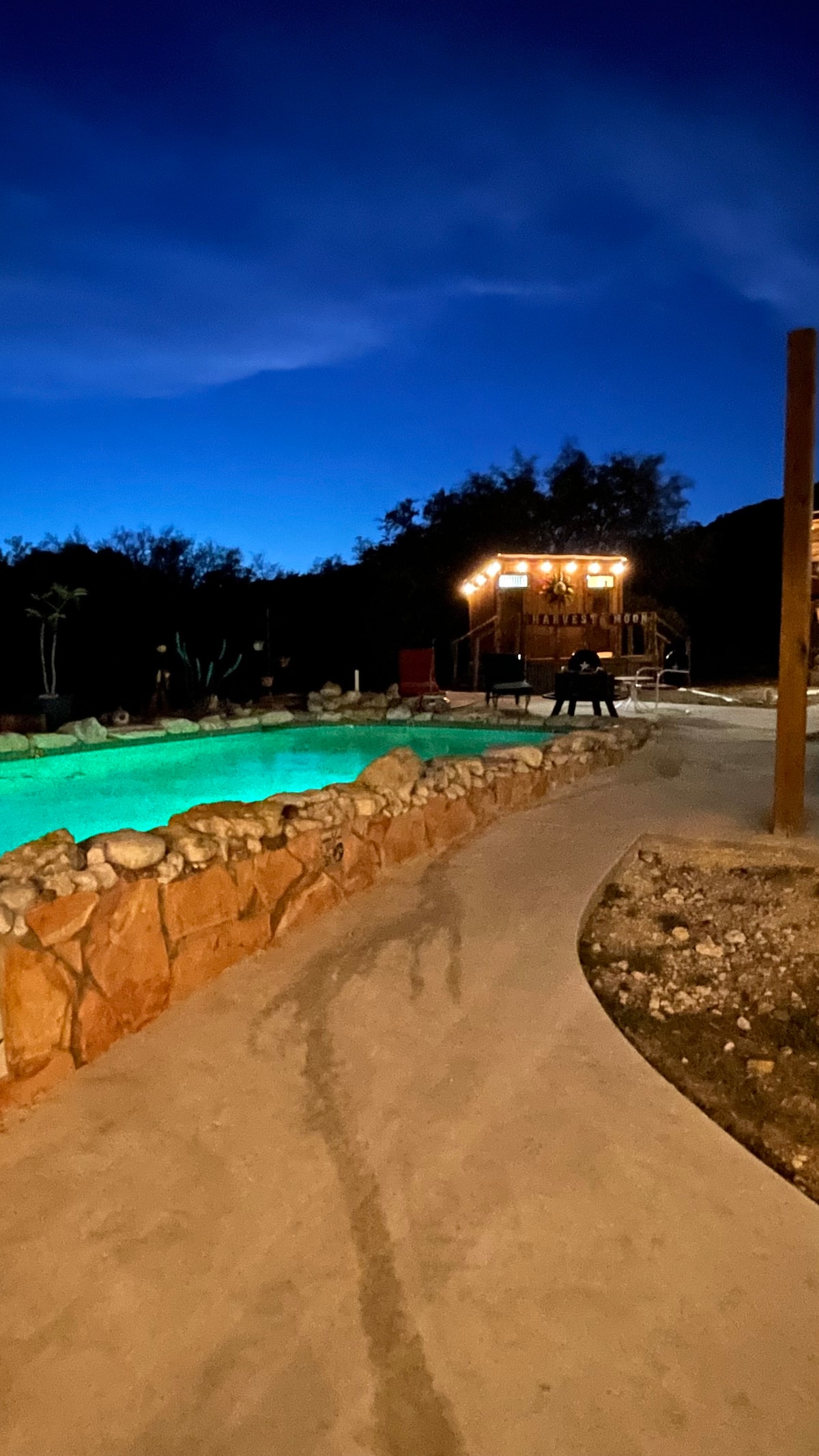 "Amadeo" is a secluded 9 acre get away on Saddle Mountain all to yourself, not shared. 2 cabins with 2 full baths & glorified outhouse/shower by salt water pool & spa. Outdoor lounging, covered dining areas, game area, star gazing by the fire pit. We are located 1 mile from river crossing, 5 mins from town, 10 mins from Garner. Beautiful sunsets and view of the hills, also hiking. Each cabin has queen bed, full loft, full futon couch, covered porches. We also love our guests’ fur babies!
