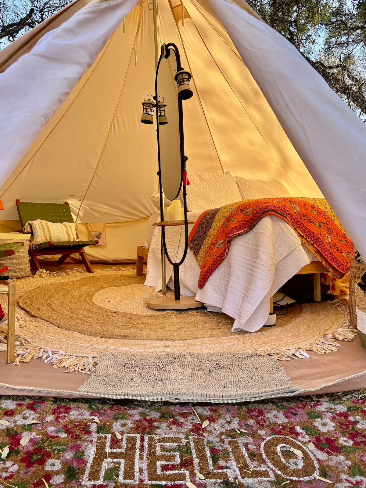 Welcome to Oak Retreat! Oak Retreat is luxury glamping at its best, located just 15 miles south of downtown, our tent includes a king size bed, A/C, en-suite bathroom with walk-in shower, private hot tub, coffee, wifi, and more. Relax outdoors, take a nap in your hammock chairs, indulge in a soak in your private hot tub or snuggle in bed while you watch a movie on your own projector. Oak Retreat has everything you'll need for a relaxing stay in the hill country.