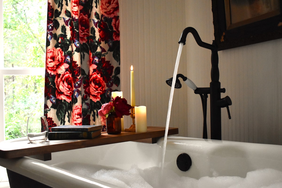 Maybe I'm a little partial, but I really have to pinch myself when I go visit Callie's cottage. Imagine...a beautiful country road, quiet except for the occasional sound of a cow. A cottage tucked into an abundance of trees, wrap around porch, flagstone firepit area, patio lights strung across the yard, antique mantle with gas fire, crystal chandelier, beadboard from an 1800's farmhouse, a tub big enough for two, the lushest bedding, classical music plays, sweets served. Deep sigh.