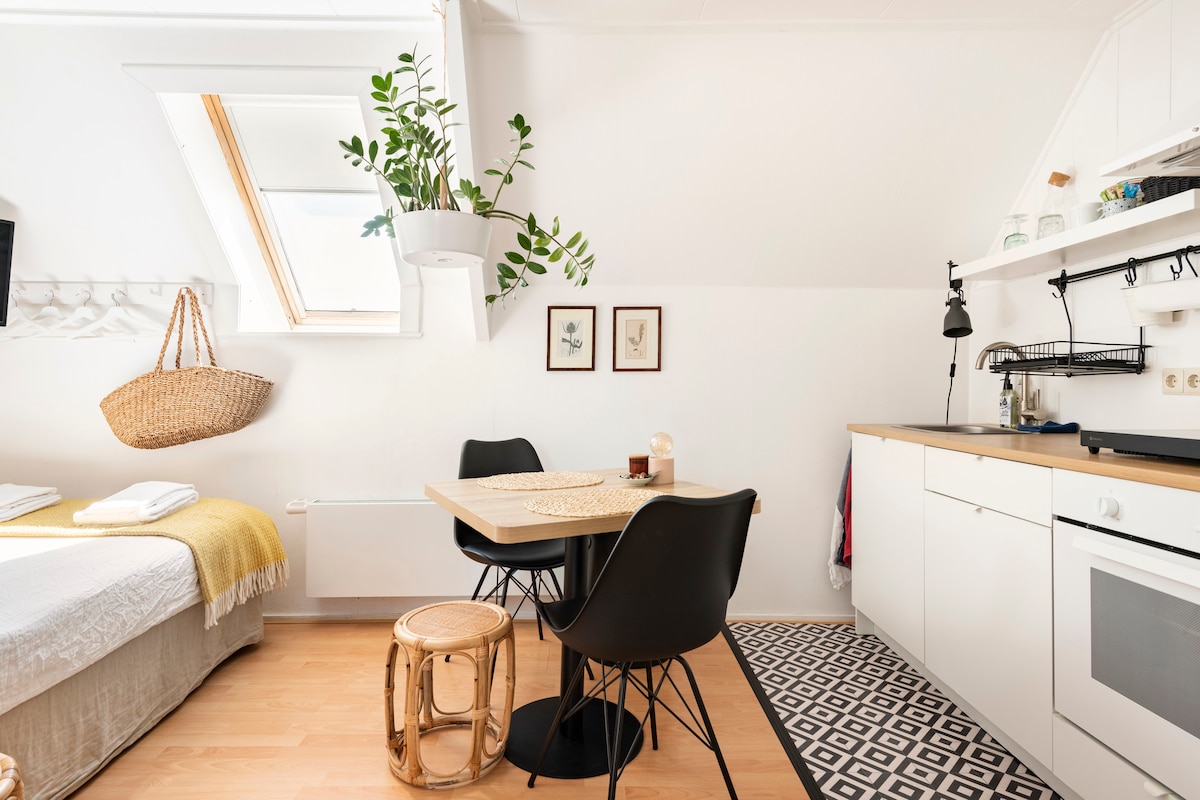 Relax and unwind in this peaceful, mid-century inspired vacation studio. A lovely studio with a spacious living room, private (separate) bathroom, sleeping loft (note: narrow steep staircase) and private outdoor terrace with seating and parasol. The studio has a spacious kitchen counter with various kitchen facilities. The studio is remarkably light through the many windows. Please note: due to the narrow and steep stairs to the sleeping loft, it is not suitable for the elderly or disabled.