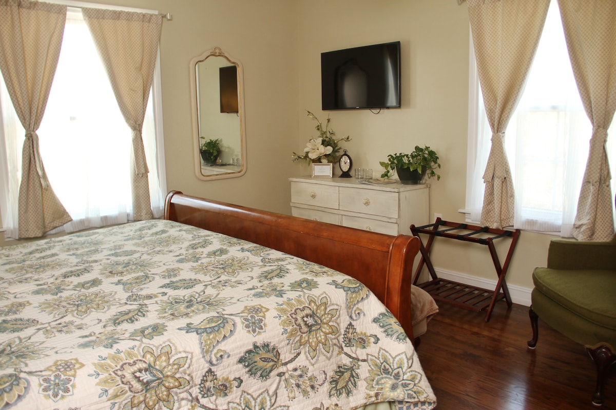 Gainesville is known for its abundance of beautiful historic homes and lovely gardens, many restored to their original splendor. This room celebrates that past with light and airy colors and décor reminiscent of a garden in bloom. The bathroom features an antique claw foot tub and shower.
