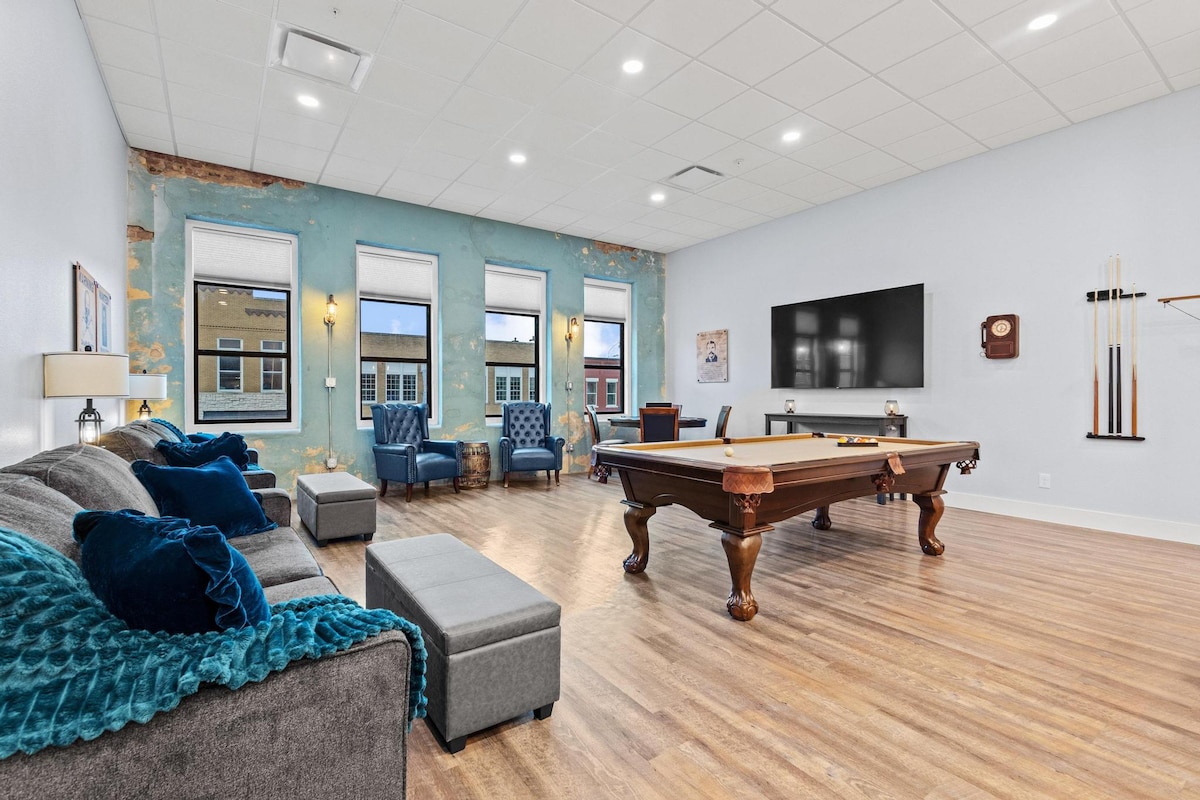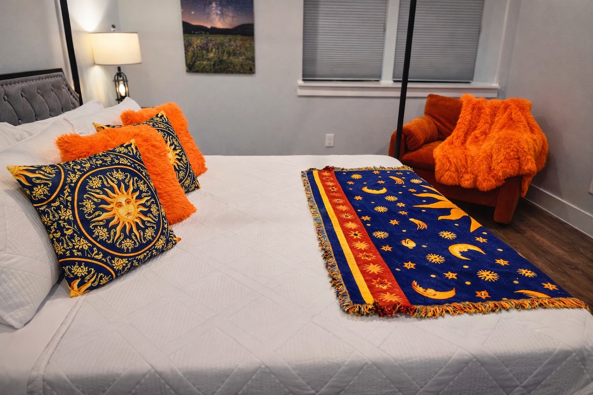🌌 A refined, space-inspired loft w/ a dramatic skylight alcove and a life-size astronaut lit by a glowing moon. ✦ Two King bedrooms with crisp linens + additional sleeping for up to 7✦ ✦ Entertainment: Air Hockey + 2-player arcade table✦ ✦ Ambient star projector and elevated lighting accents ✦ ✦ 85" Smart TV + Fast Wi-Fi ✦ ✦Fully stocked kitchen for in-home dining ✦ ✦ In-unit washer/dryer combo w/ detergent ✦ ✦ Premier Main St location steps from dining and boutiques ✦