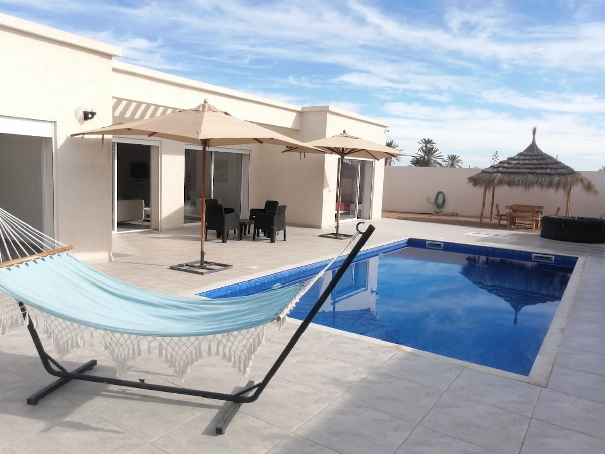😍🏖‼️VILLA OUMAYMA‼️ 🏖🌞🏝 cette magnifique villa de plan-pied située dans un quartier résidentiel et calme à centre tezdaine Se compose d'un salon cuisine ouverte salle d'eau 2chambres 1 suite parentale Piscine sans vis-à-vis 9m/4m pataugeoire 4m/4m Abri voiture Trampoline Douche et toilettes extérieures Barbecue bord de route Banquette Bonne voisinage Bien placé 3 minutes de la plus belle plage de l’Ile de Djerba saguia et yati Commerce à-côtés 5 min de centre midoun