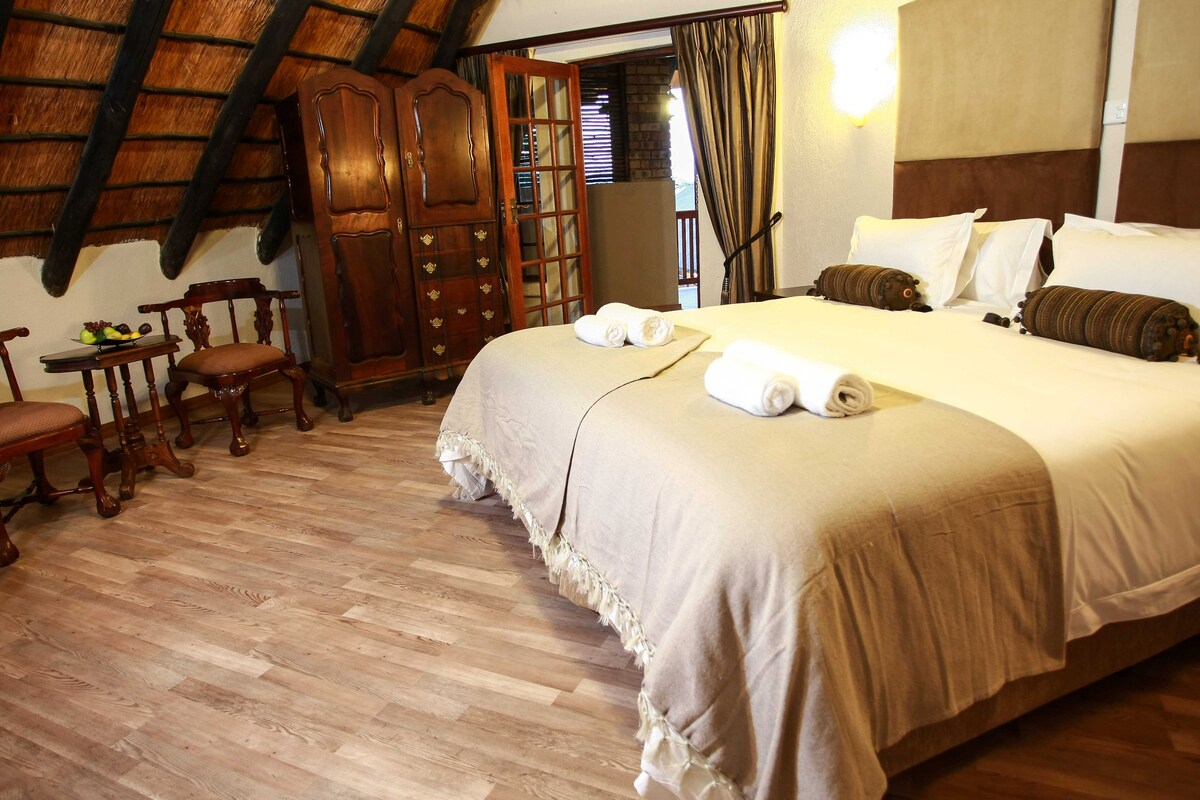 Tastefully furnished, queen sized bed, fully air-conditioned and are equipped with satellite TV, Internet as well as tea and coffee making facilities. Leads out onto the tranquil gardens where zebra and wildebeest wander by.