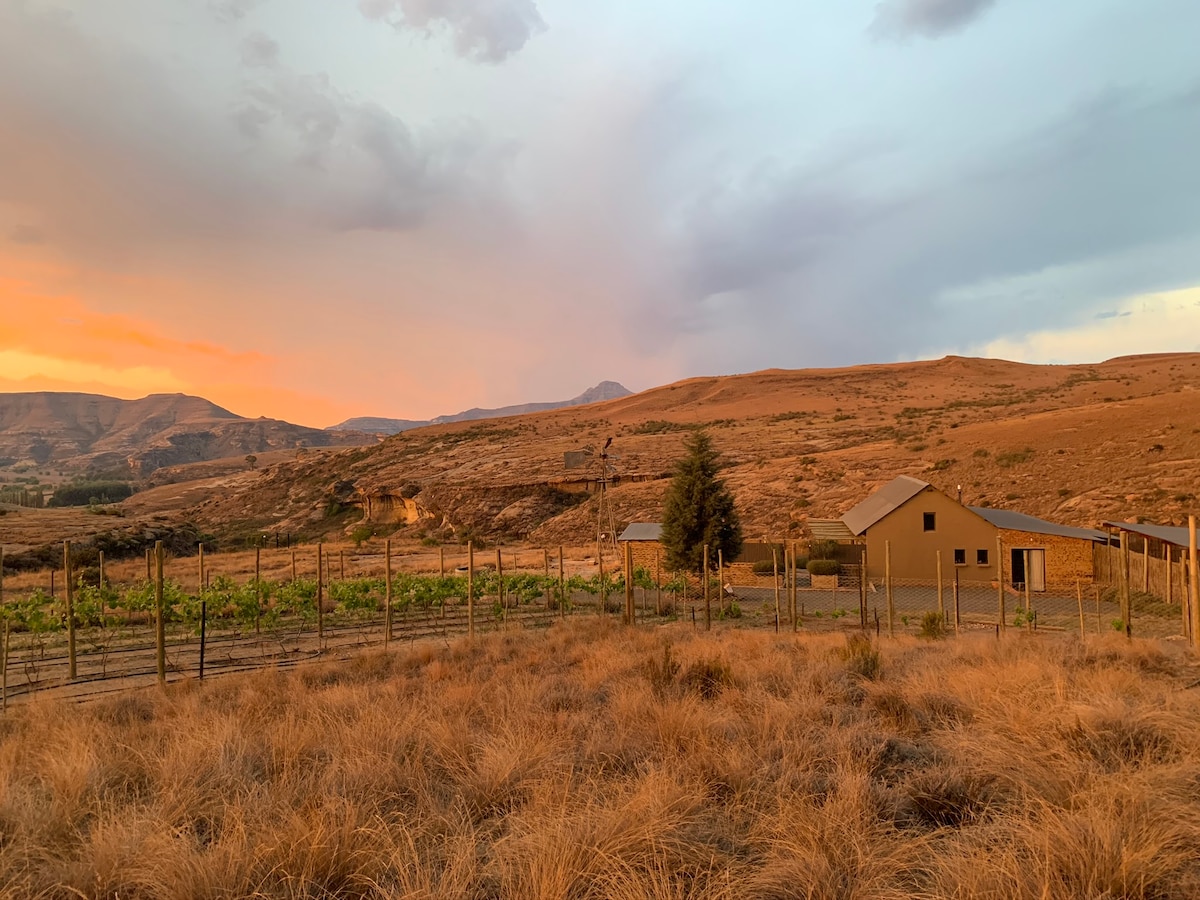 Clifton farm house is located on a working farm in the Clarens countryside and offers guests a beautiful and peaceful stay. The farm is ideal for hiking, bird watching and mountain biking, followed by a few drinks round the fire. The house is suited to accommodate 4 guests in two private bedrooms each with own bathroom fitted with bath and shower. All doors open out onto a large patio overlooking the mountains and farm. The house has an outdoor braai for guests to use.