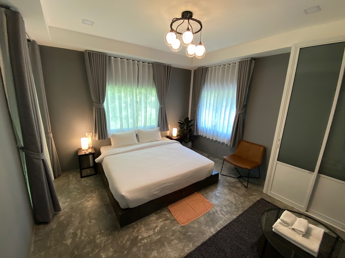 A peaceful and minimal retreat just 15 minutes from downtown Chiang Mai. 🌿 • Bright, cozy space with high-pitched roof and open design • Teak wood furniture and Japanese-inspired simplicity • King-size bed, fast Wi-Fi, and space to relax or work • Ideal for couples, solo travelers, or small families 👉 For 3 guests, a premium mattress with full bedding is set up for a restful sleep (only when booked for 3).