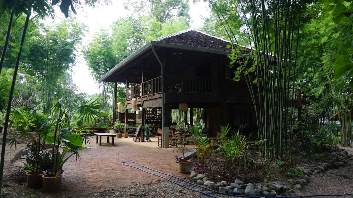 Our teakwood house is set on a large private estate next to Doi Luang National Park, just 1.5 km from the hot springs, with a spectacular mountain view. Surrounded by bamboo and teak forest, it offers a peaceful, safe atmosphere filled with birdsong and the sounds of nature. Though immersed in nature, it’s just 3 km from the village. A perfect place to relax, reconnect, and enjoy Chiang Dao’s natural beauty.