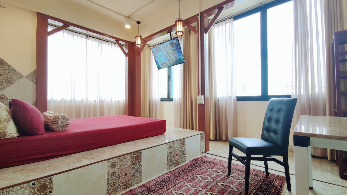 Immerse yourself in elegant tranquility at our spacious studio in the heart of Bangkok. Housed in a renovated shophouse, it features a king bed, full kitchen, and a stunning bathroom. Explore the vibrant neighborhood or unwind with complimentary Wi-Fi, Roku TV, and on-site coin-operated laundry. Our mix of comfort, character, and convenience promises an unforgettable city experience. Experience the charm of Bangkok while enjoying modern comforts in a peaceful haven amidst the urban buzz