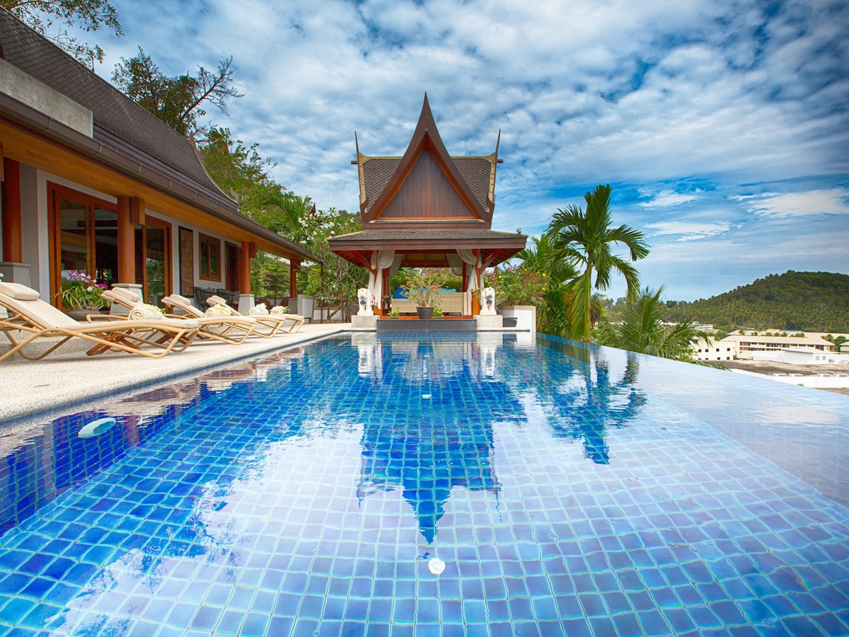 Magnificent, luxurious Thai-style Villa perched on a mountain tranquil estate overlooking Surin and Bang Tao beaches on Phuket's beautiful west coast. Villa of 400m2 interior, 4 bedrooms with King-sized beds, en suite bathrooms. Fully furnished and decorated with Asian Art pieces. Infinity-edge pool is 14 x 5 meter with 2 Thai Salas on each side for outdoor relaxing and breathtaking views. Surin Beach is only 10 minutes walk from the villa. Included Breakfast and Two way Airport Transfers.