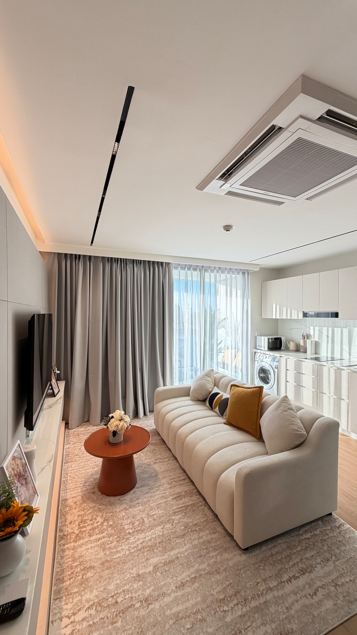 Step into a modern one-bedroom apartment designed with elegant contrast and refined simplicity. The thoughtful layout combines tropical serenity with contemporary design, creating a tranquil retreat just moments from Bang Tao Beach. The fully furnished interior exudes warmth and sophistication, featuring a living and dining area that opens onto a partly covered terrace — the perfect spot to unwind, dine, or entertain outdoors. Every element is designed to balance style and comfort. Stil.