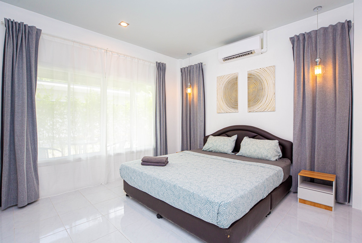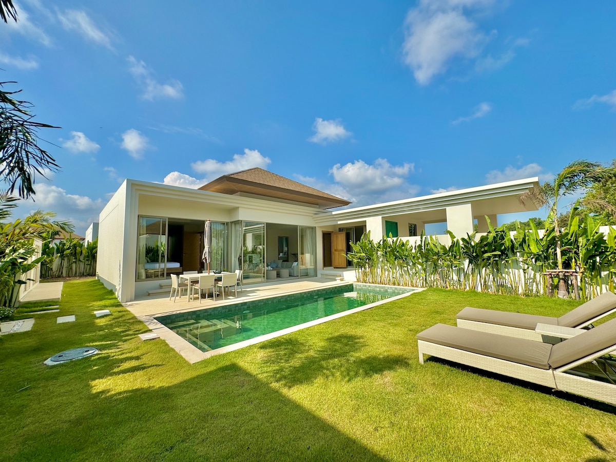 Contemporary design pool villa with 3 bedrooms (2 king size , 1 queen size and 2 bunk beds) 4 bathrooms included all service: amenities, towels, beach towels, drinking water, cleaning and linen change once a week. The location is developing area, it easy to connect to many area, 5 mins to Blue Tree(lifestyle complex), 10 mins to Beach, 30 mins to Airport