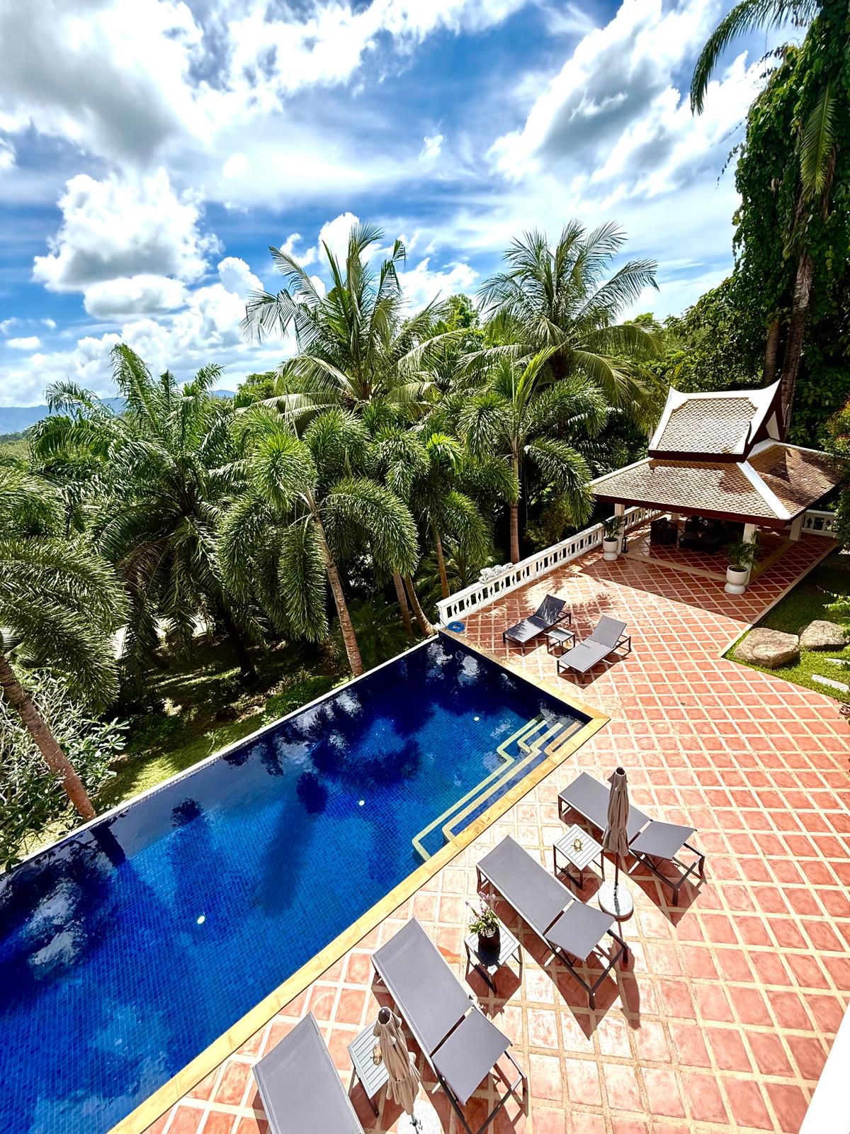 Magnificent, luxurious Thai-style Villa perched on a mountain tranquil estate overlooking Surin and Bang Tao beaches on Phuket's beautiful west coast. Villa of 400m2 interior, 4 bedrooms with King-sized beds, en suite bathrooms. Fully furnished and decorated with Asian Art pieces. Infinity-edge pool is 14 x 5 meter with 2 Thai Salas on each side for outdoor relaxing and breathtaking views. Surin Beach is only 10 minutes walk from the villa. Included Breakfast and Two way Airport Transfers.