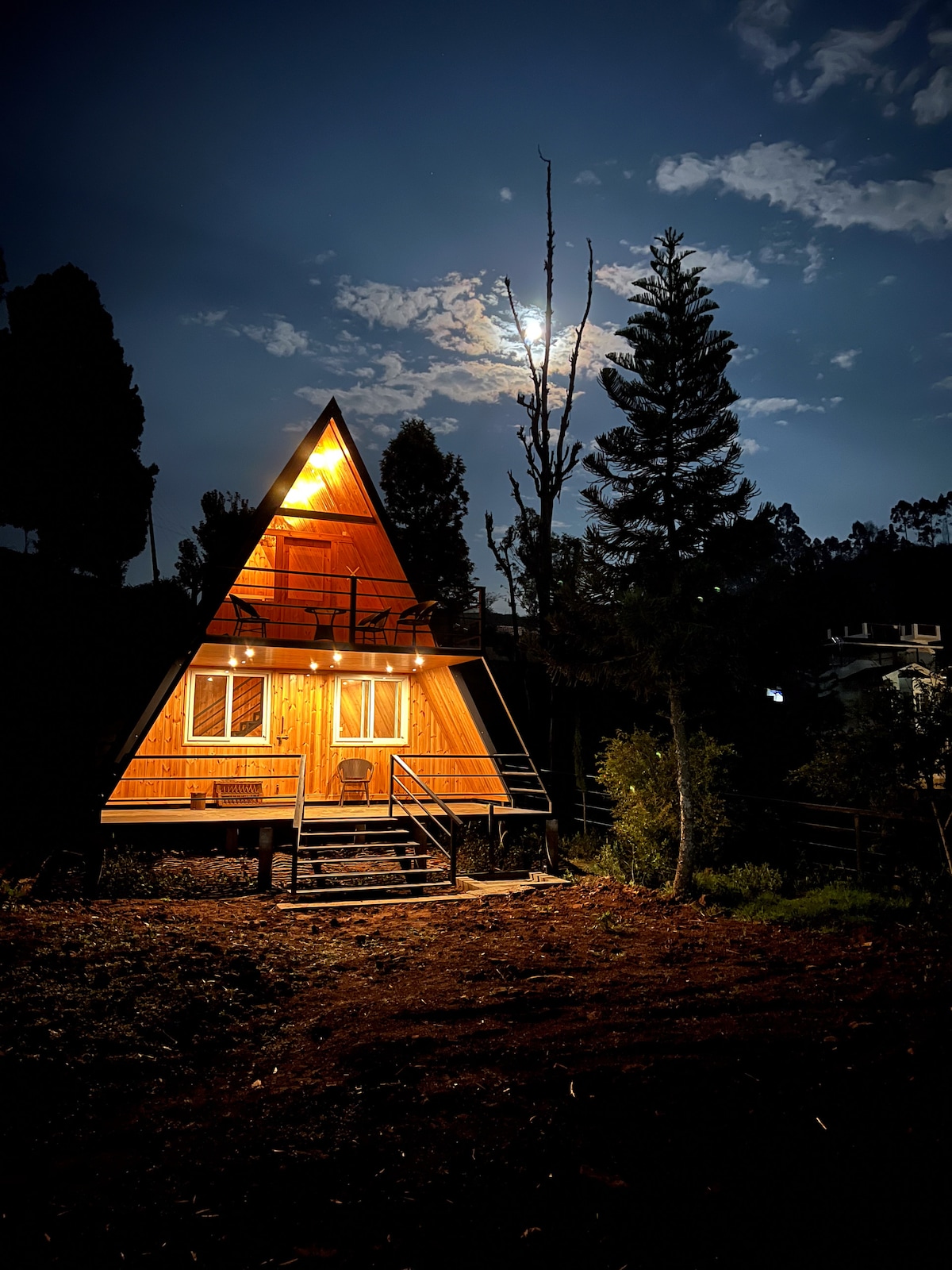 This A-frame, 3-bedroom house is on a quiet street in Vilpatti, just 6 km from the central Kodaikanal. With nearly three-quarters of the front built with glass, the living room offers amazing views of the serene mountains. The house features a beautiful, extensive patio, a mini library, comfortable work seating, and a fully functional kitchen, making it perfect for families with kids. The sunrise view, with rays falling on the mountains, is best enjoyed from the first floor.