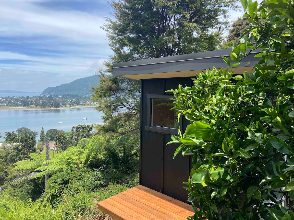 Enjoy big views in a unique little space of your own. Our air bnb cabin is nestled in a private area at the bottom of our property. There is a separate bathroom facility that includes a toilet and small sink plus a hot outdoor shower. The cabin has a comfortable queen size bed and facilities to make a hot cuppa. We are a 10minute stroll from central Tairua where you can find a number of eating options. The surf beach is a 5 minute drive or 30minute walk.