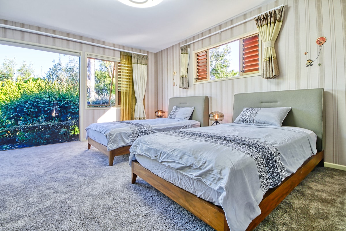 Our home at Cooks Beach boasts 4 large bedrooms with 7 comfy beds: 2 x queen, 1 x double and 4 x single, to accommodate a maximum of 10 people. It has an open plan lounge, dining and kitchen area which opens up to two separate outdoor areas. BBQ available, a TV and full laundry facilities. We are only a 3 minutes’ walk to the beach and a 10 minutes’ walk to Purangi estuary, 5 minutes drive to Ferry Landing and short ferry ride to Whitianga with fantastic Restaurants, Cafes and Shopping.