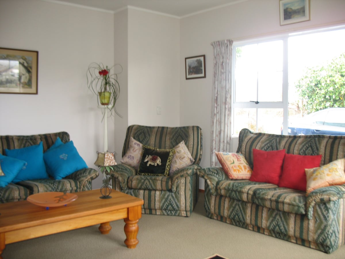 This Architect's own Eco-Bach is nestled next to an 18-hole golf green overlooking a tranquil lake with the mountains behind. This location will be a perfect spot for aspiring golfers. The amazing sun sets/sun rises are seen here frequently and going to the beach is a 10 mins walk. This new 2-storey cedar clad house has 4 bedrooms, 2 separate lounges, 2 bathrooms and separate WC, has a Billiard Pool table and can accomodate 10 people. Two timber decks are available for outdoor entertaining.