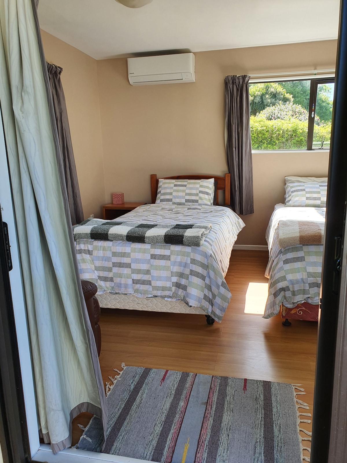 This studio is tucked away in the corner of the property a long deck separates it from the house. It has 2 x beds, 1 single and 1 x king single, a separate bathroom with shower and toilet. There is a kettle with tea/coffee available, a toaster, a fridge and a microwave. It's a small no frills space that is tidy, quiet with a lovely rural view from the window. It has no WIFI or TV(can you survive!) Parking is close by and safe but you do have to walk about 30m across lawn to access it. Uncovered.