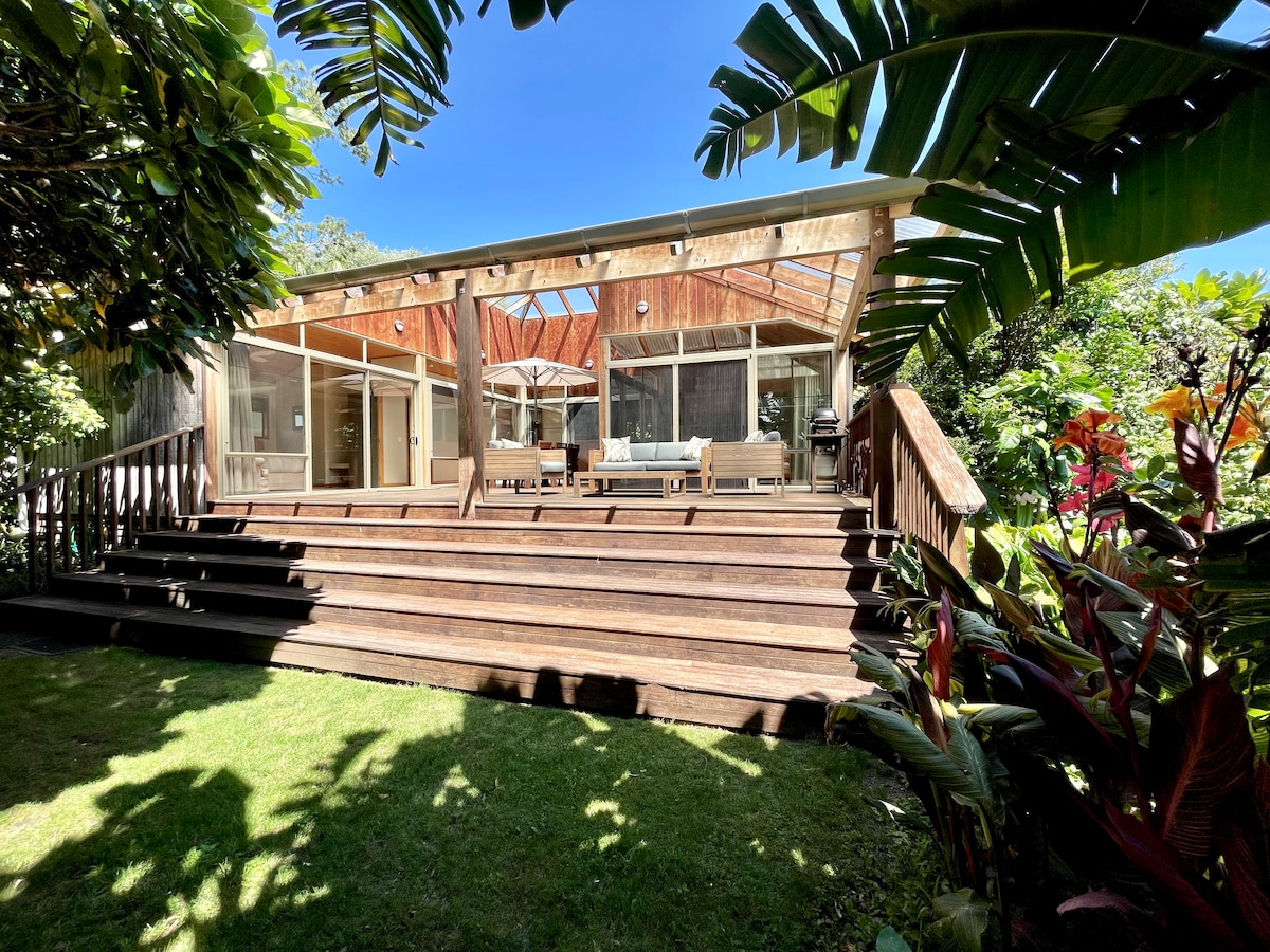 Purpose built as holiday accommodation Te Puia Lodge is not your average kiwi bach. Nestled in private gardens, Te Puia Lodge is the perfect hideaway for people wanting to get away from it all. Couples and families alike will enjoy the spacious design and indoor-outdoor flow.