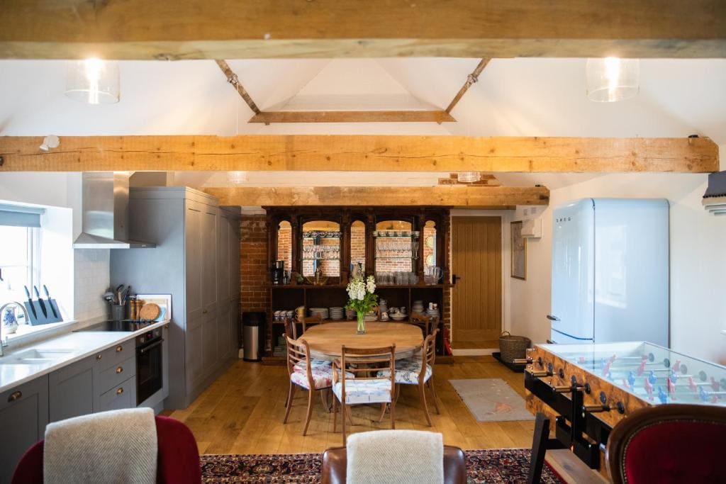 This stunning, renovated Victorian Farm, red brick barn is nestled on the idyllic Romney Marsh Ridge. The Cowshed Port Lympne benefits from a spacious garden to the rear and amazing views across the fields towards the North Downs area of outstanding natural beauty to the front. A short drive to many beaches, the coastal towns of Hythe and Folkestone (with its Harbour and Pier) and under a mile from Port Lympne Animal Reserve. It is also near many vineyards incl Gusborne and Chapel Down.
