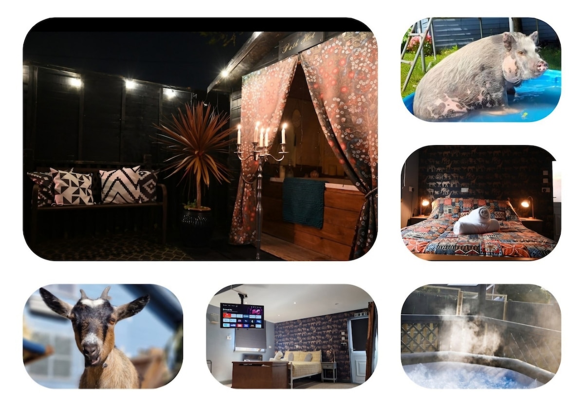 Arrive to relaxing music and candle lit romantic studio space. Request the company of our hilarious pygmy goats or Pablo the pig in the enclosure located in your garden. Quirky, bohemian styled decor throughout. Private atmospheric decking areas and garden. So much to enjoy...hot tub, Pizza oven, BBQ, chimnea and the very popular boho bath house . Enjoy candle lit evenings in the giant tub ideal for couples to share or unwind in the hot tub. Ideal for couples but can sleep 4 plus travel cot.