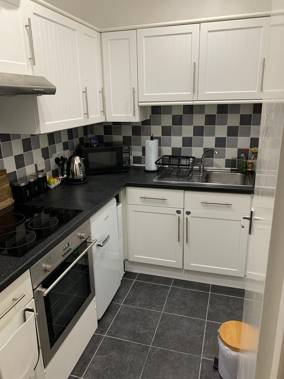 Modern, newly decorated basement flat with smart home technology for zoned lighting control. Features two bedrooms, open-plan lounge with corner sofa, and flat-screen TVs with Netflix. Kitchen includes modern appliances: filter tap, American-style fridge/freezer, dishwasher, microwave, and pod coffee machine. Bathroom with bath and shower. Utility room and dedicated work area. Free on road parking and WiFi via QR code. Self check-in. Family friendly. Contractor friendly.