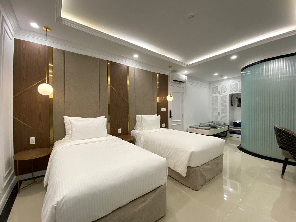 Enjoy a comfortable stay in our Quadruple Room at Varia Hotel-perfect for families or groups of up to four. The room features two queen beds, cozy modern décor, air conditioning, free Wi-Fi, a flat-screen TV, minibar, and a private bathroom stocked with fresh towels and toiletries. A large window offers lovely views of the city, adding to the relaxing atmosphere. Located just steps from Dinh Cau Beach and the vibrant night market, it's the ideal base to unwind and explore the best of Phu Quoc.