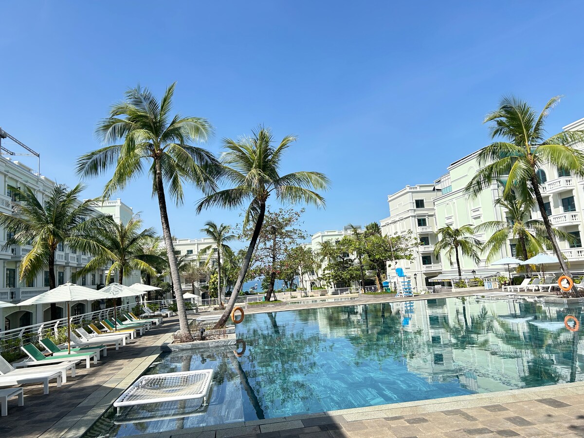 Hello, this is a villa located at Bai Kem Phu Quoc with a very beautiful coastline, with neighbors such as JW Marriot Phu Quoc, New World Phu Quoc, ... The villa gives you a familiar and close feeling with 4 bedrooms + 1 living room + 1 fully equipped kitchen for cooking, ... Especially with the Jacuzzi Massage pool that brings relaxation to the whole family. The villa has 3 floors but has an elevator so it is convenient to move between floors. Invite you to stay and experience more 🥰