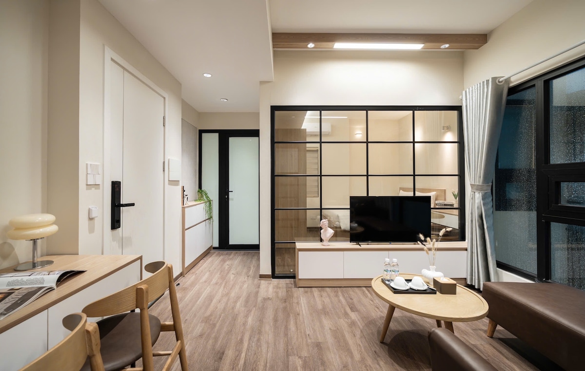 This bright and compact room offers a large window beside the bed, bringing in plenty of natural light and a sense of openness. You'll find a well-equipped kitchen corner with a stove, microwave, and refrigerator — ideal for preparing simple meals. Though modest in size, the space is thoughtfully designed to provide both comfort and convenience, making it a perfect choice for solo travelers or couples.