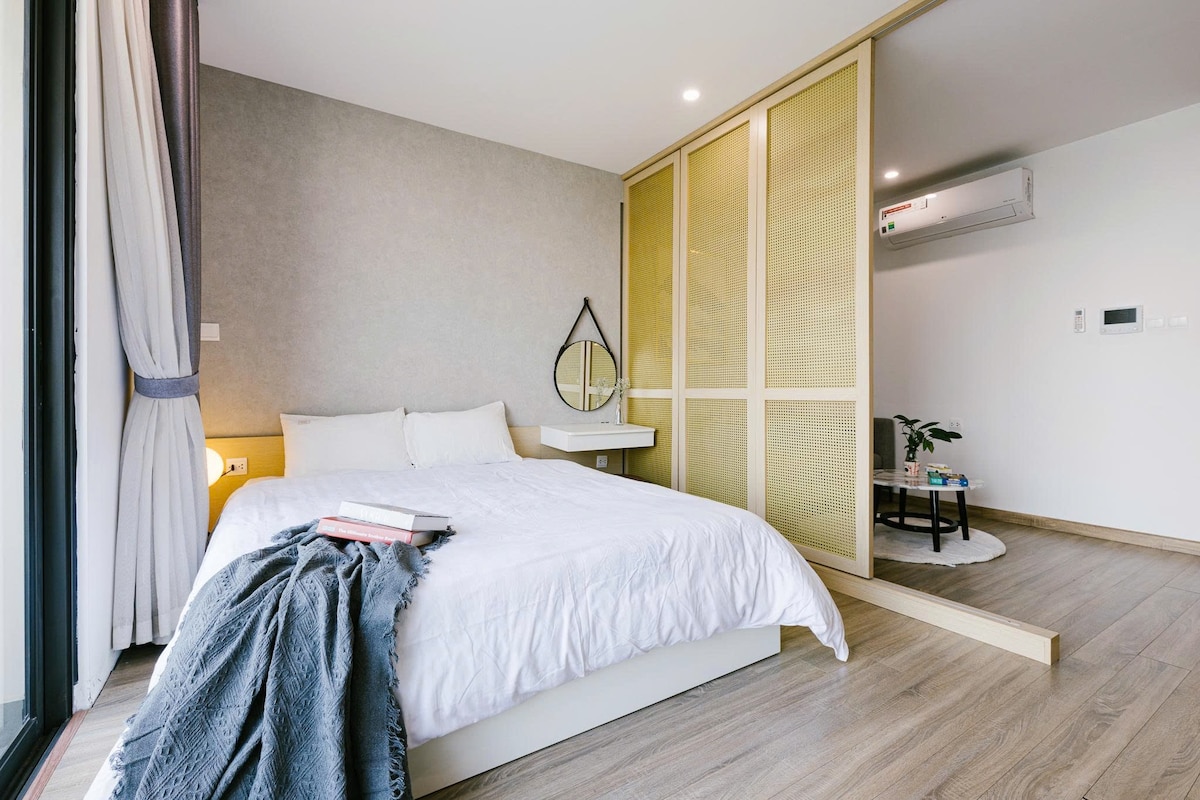 This is a spacious studio apartment located on the 22nd floor of block C2, D’Capitale Complex. With an area of 35m2, the apartment with wooden floors creates a cozy but still airy feeling with a large balcony. Beside the queen bed, the apartment has 1 bookshelf, a large sofa, and a dining table for 2 people. The kitchen is fully equipped with kitchen utensils, suitable even if you have a long stay. The apartment also has a smart SAMSUNG TV with Netflix and fast internet for remote working.