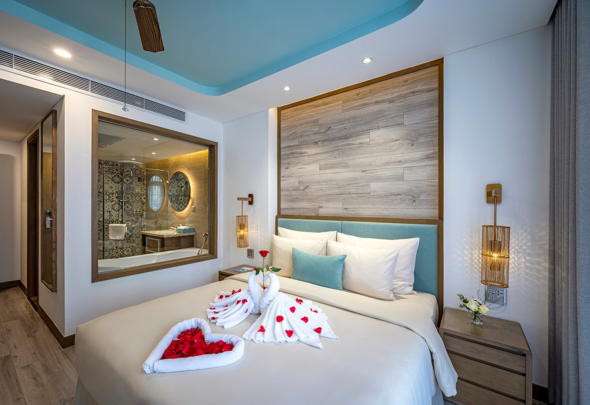 River View Room – Lãng mạn & riêng tư bên dòng sông Là hạng phòng đôi dành cho 2 người, nổi bật với ban công riêng và bồn tắm view sông đầy lãng mạn. Đây là không gian lý tưởng để bạn tận hưởng những buổi chiều lộng gió, nhâm nhi ly rượu vang hoặc thư giãn trong bồn tắm, ngắm nhìn dòng sông êm đềm trôi. Phòng được thiết kế tinh tế, sang trọng và yên tĩnh — mang đến trải nghiệm riêng tư, đậm chất nghỉ dưỡng: Menu đồ ăn phong phú, bể bơi nước mặn, không gian trải nghiệm xanh mướt.